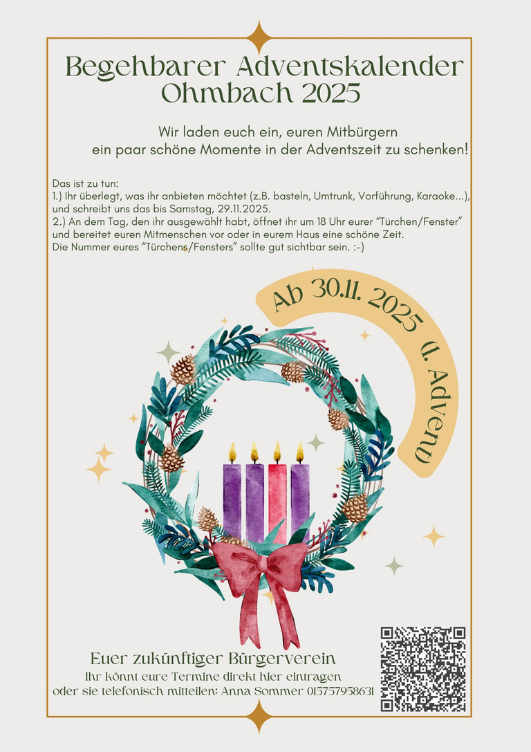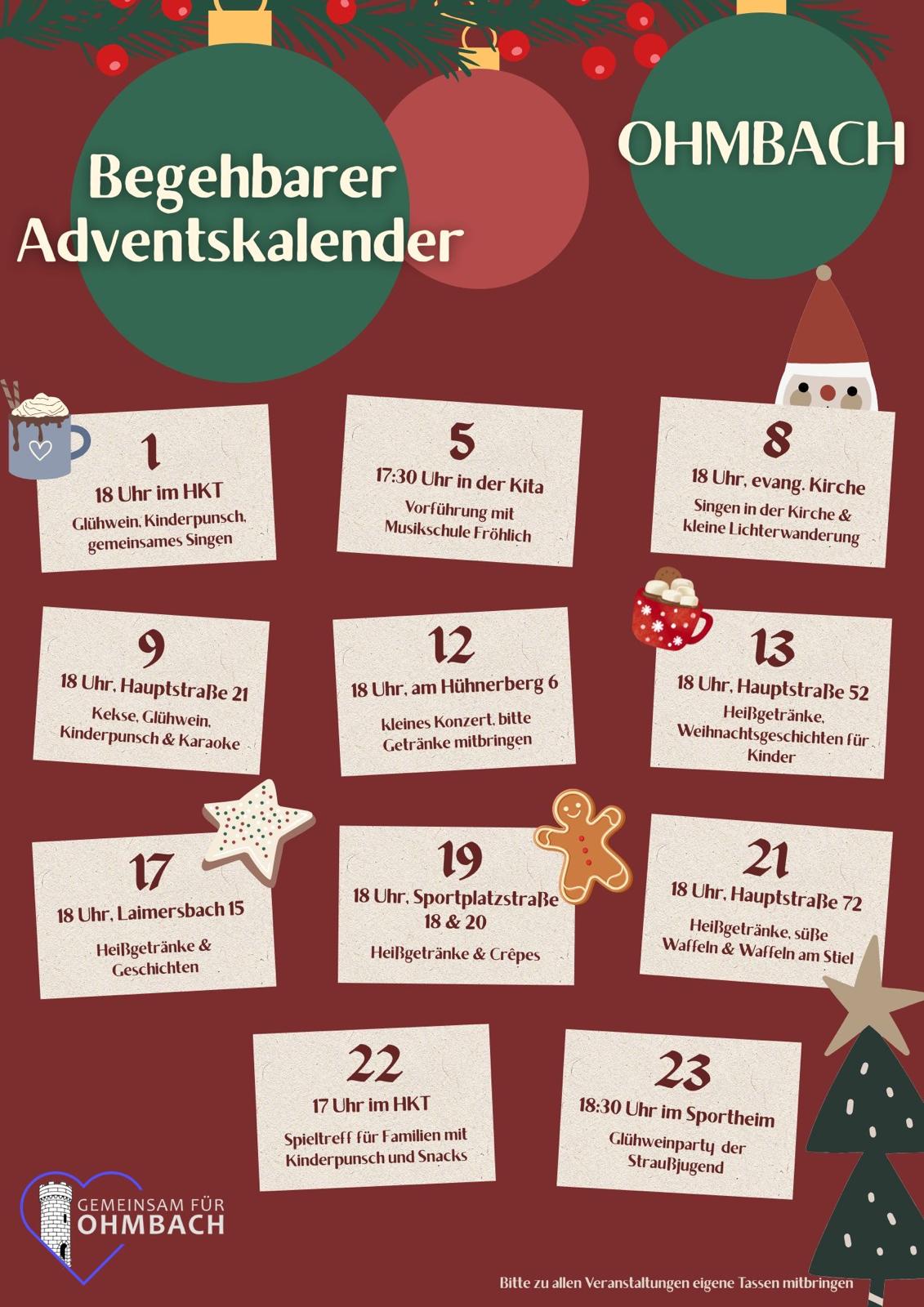 Der zukünftige Bürgerverein “Gemeinsam für Ohmbach” lädt als “erste Amtshandlung” in Kooperation mit verschiedenen Ohmbacher Vereinen, Institutionen und Bürgerinnen und Bürger herzlichst zum begehbaren Adventskalender ein und hofft, mit einem breiten und bunten Angebot möglichst vielen Ohmbacherinnen und Ohmbachern die Adventszeit zu versüßen.