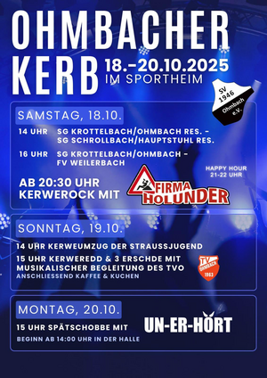 Am Kerwesamstag, dem 18. Oktober, beginnt der Tag um 14 Uhr mit einem Fußballspiel der zweiten Mannschaft der SG Krottelbach/Ohmbach gegen die zweite Mannschaft von Hauptstuhl. Um 16 Uhr, spielt dann die erste Mannschaft gegen den FV Weilerbach. Die Gemeinde ist herzlich eingeladen, die Mannschaften zu unterstützen und die sportliche Atmosphäre zu genießen. Am Abend wird die Partyband „Firma Holunder“ ab 21 Uhr auftreten. Zudem wird von 21 bis 22 Uhr eine Happy Hour angeboten.